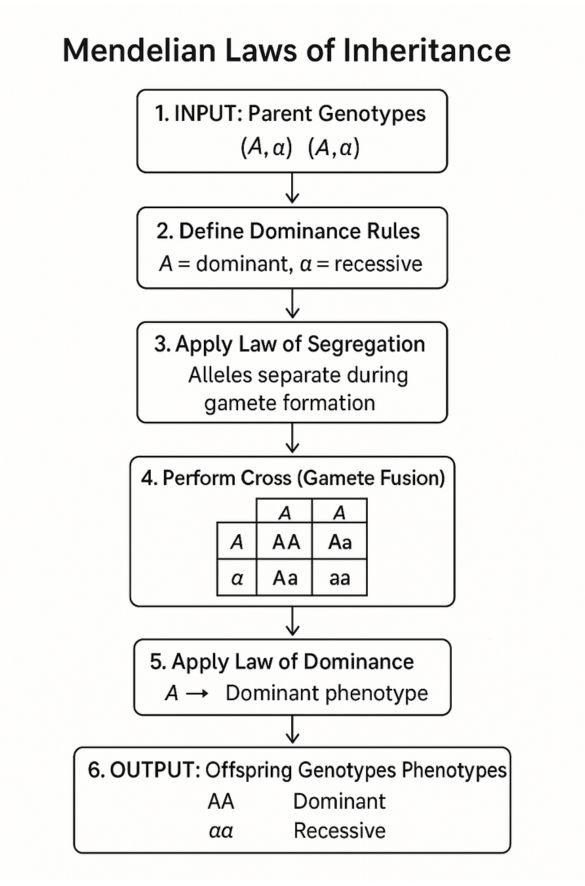 A key insight from Mendel’s early crosses challenged the prevailing “blending” theory of inheritance. When Mendel cross-pollinated purebred plants with contrasting traits (e.g., smooth seeds x wrinkled seeds), the F1 generation did not exhibit an intermediate blend of the traits. Instead, all the offspring displayed the phenotype of only one of the parents. Mendel termed the expressed parental trait the dominant trait, and the trait that seemed to disappear in the F1 generation he called the recessive trait. From this observation, Mendel proposed his principle of uniformity, stating that the progeny of a cross between purebred parents differing in a single trait would be uniform and resemble only one parent. There are some exceptions to this principle, such as incomplete dominance and codominance, which were discovered after Mendel’s time.